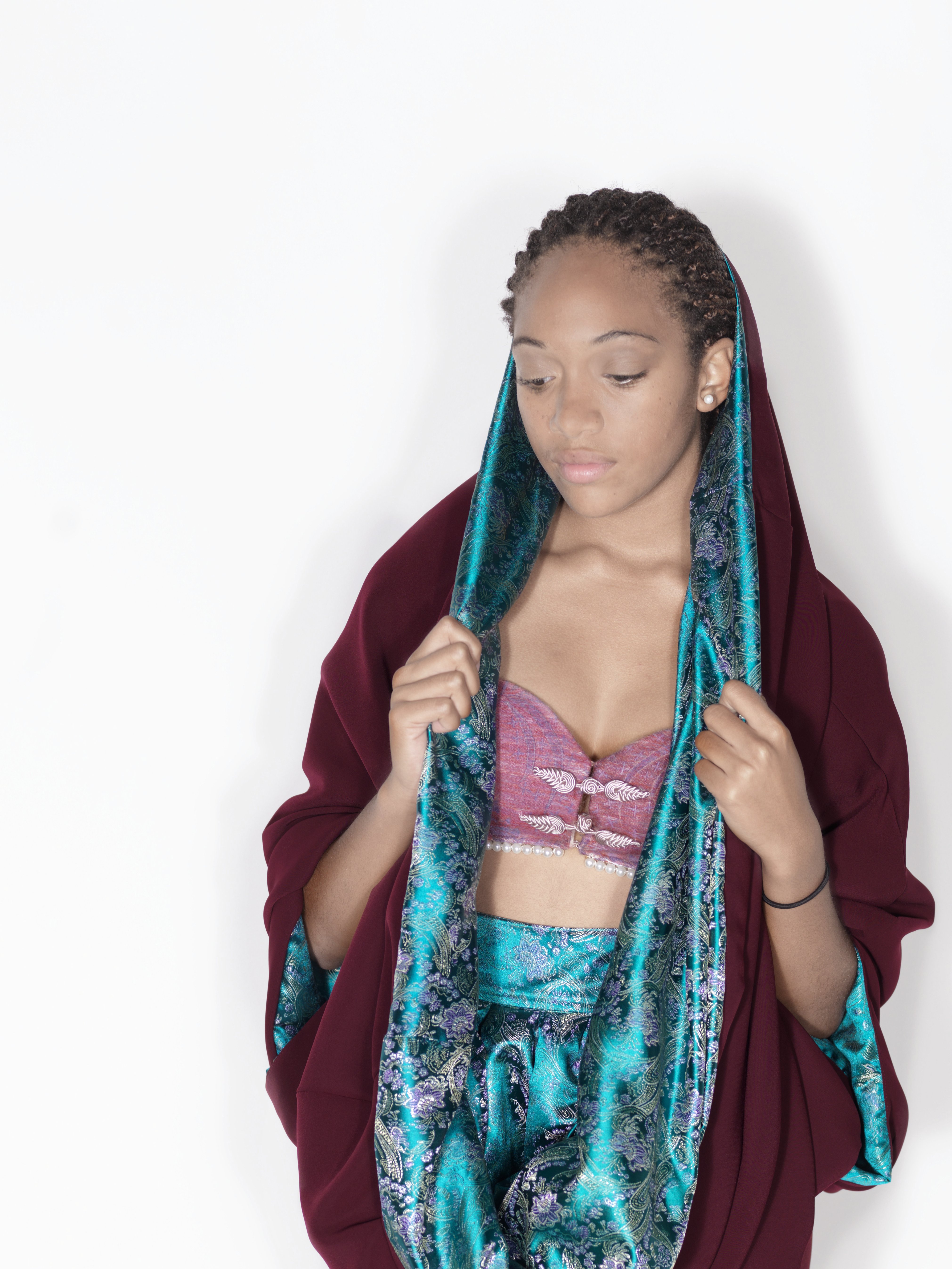 Tanuvo embodies the theme of diverse women through the reveal of layers. Around the world, women are still divided into stereotypical categories: modern or traditional and provocative or modest. Yet, women prove time and time again that they cannot be easily defined. This is represented in the transformation of the pieces from classic burgundy shapes to a visual display that is dynamic, full of life and does not constrict women.